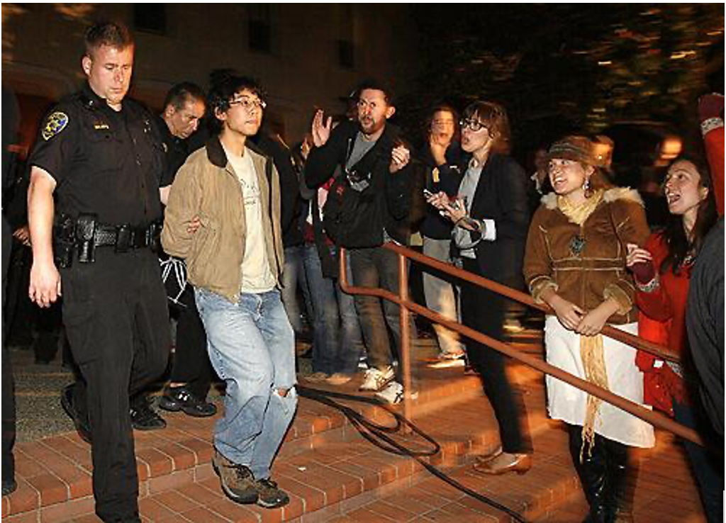 “Brian Ang is led out from Mrak Hall after being arrested during a protest Nov. 19, 2009.” Photo by Fred Gladdis for The Davis Enterprise.
