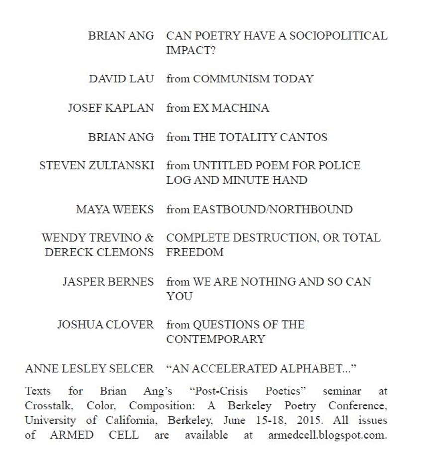 Responding to Jacket2’s Quick Question series, which asked “Can poetry have a socio-political impact?” developed my thinking on post-crisis poetics further: “In a forthcoming essay, ‘Post-Crisis Poetics,’ I connect readings of poetries that I’ve published in my magazine ARMED CELL…The project of post-crisis poetics is the constituting of a community for searching out historical conditions, sociopolitical desires, and adequate forms of struggle in the period’s unfolding transformations to come.” [24] Later that year, the Berkeley Poetry Conference 2015 at UC Berkeley, “conceived as a 50-year celebration of the Berkeley Poetry Conference that took place in 1965,” was cancelled “due to many of the invited speakers pulling out in protest of the presence of Vanessa Place (although others cancelled for various reasons).” [25] The conference was reorganized as Crosstalk, Color, Composition: A Berkeley Poetry Conference, “a new multi-day event around readings given by and seminars led by several poets of color of national reputation.” [26] Lyn Hejinian invited me to participate and I presented the conference’s final seminar on “Post-Crisis Poetics”: “Discussion will concern the post-crisis poetics concept, the seminar poetries, and further perspectives about what poetry and poetics contribute or could contribute to critically thinking about the post-crisis period in progress, including connections with participants’ works.” [27] My seminar texts were my response to “Can poetry have a socio-political impact?” and poems by David Lau, Josef Kaplan, me, Steven Zultanski, Maya Weeks, Wendy Trevino and Dereck Clemons, Jasper Bernes, Joshua Clover, and Anne Lesley Selcer, the first poems in all of ARMED CELL issues at that time, one through eight, and my work in ARMED CELL 2. [28] In my seminar I “improvised an elaboration of the post-crisis poetics concept through shuttling among the levels of the economic, the 2008 crisis and periodizings of [Fredric] Jameson, [Giovanni] Arrighi, and [Robert] Brenner; the political, post-crisis struggles including the 2009 California university movement, the Arab Spring, the Wisconsin occupation, Occupy, and Black Lives Matter; and the poetic, thoughts on an historicized critical poetics.” [29]