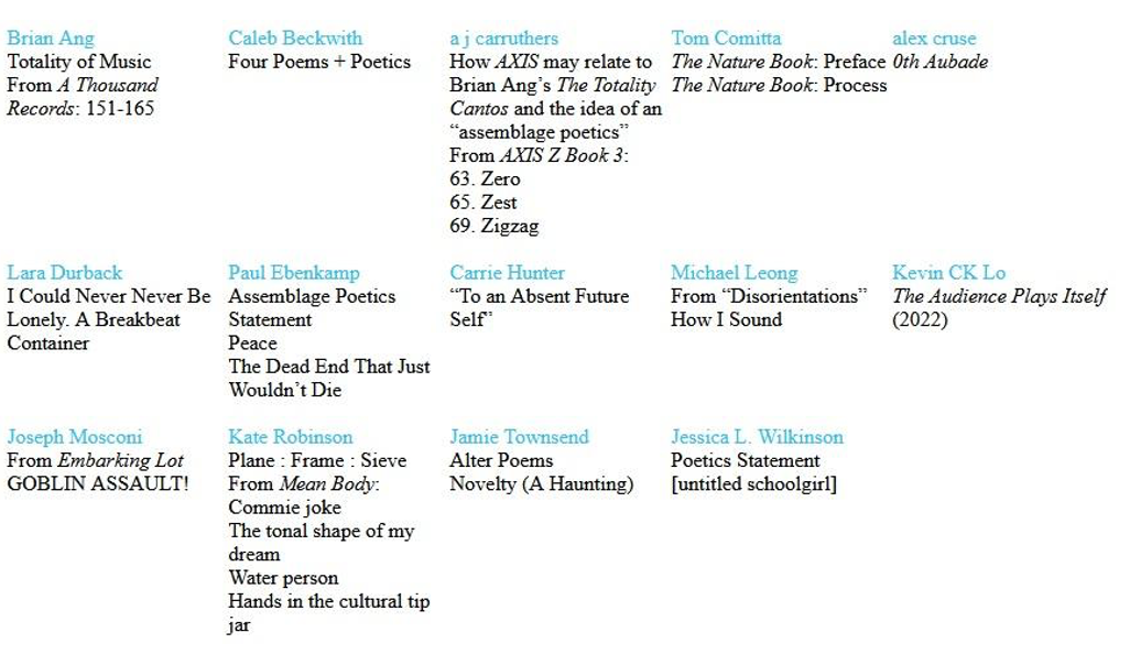 Assemblage Sampler, ed. Brian Ang (2023), contents