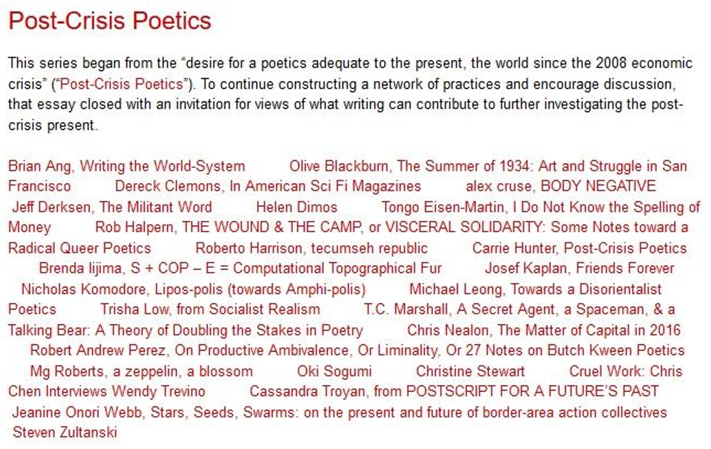 The Post-Crisis Poetics series was serialized a piece per day in alphabetical order through April 2017 and consisted of twenty-five pieces by me, Olive Blackburn, Dereck Clemons, alex cruse, Jeff Derksen, Helen Dimos, Tongo Eisen-Martin, Rob Halpern, Roberto Harrison, Carrie Hunter, Brenda Iijima, Josef Kaplan, Nicholas Komodore, Michael Leong, Trisha Low, T.C. Marshall, Chris Nealon, Robert Andrew Perez, Mg Roberts, Oki Sogumi, Christine Stewart, Chris Chen and Wendy Trevino, Cassandra Troyan, Jeanine Onori Webb, and Steven Zultanski. [39]