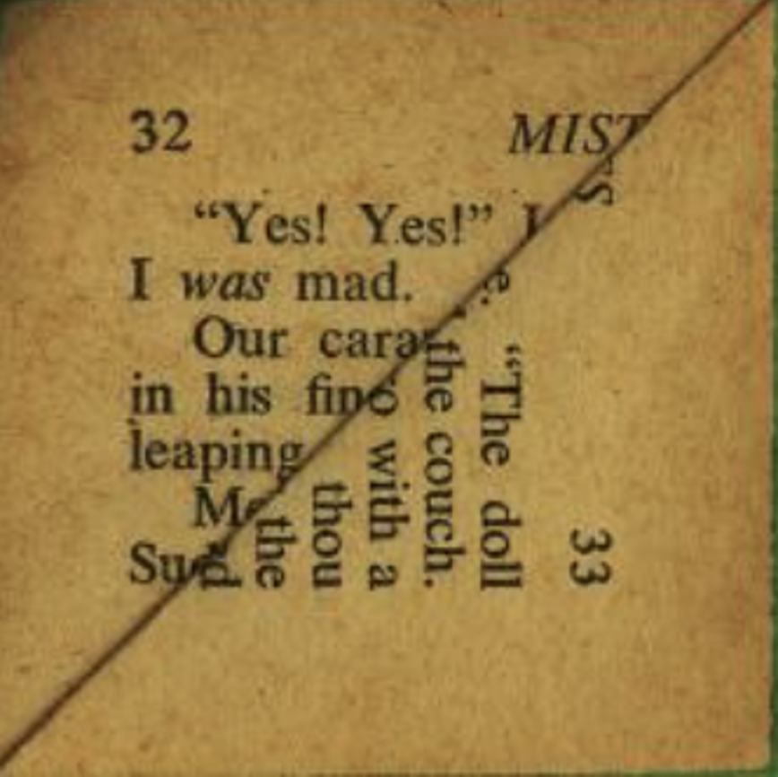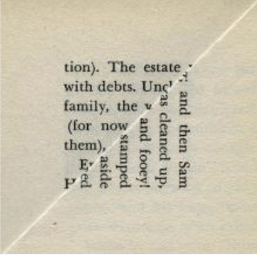 Still, even falling short of asemic, these dog ear folds disrupt conventional communication. While they indeed create a new, interesting synergy between the horizontal and vertical lines, what I’m most interested in is reading and riding along this letter-slicing diagonal line that demarcates a horizontal “before” text from vertical “after” text. I think Dog Ear may be asking me to round out—or more appropriately “square off”—these chevrons of text towards something consummate; the squareness of the form insinuates the possibility of perfection amid two disparate, partial passages. Squareness connotes evenness and symmetry—fairness and predictability. Because squares are calculable and knowable, I’m brought to falsely trust that these squares will contain two reconcilable halves. In these dog ears, the latter text may be part of the same book, but it arrives as a non-sequitur without the decorum of introduction—in mid-air without the runway, and with no syntactical allegiance to its predecessor. It has no past—or its past often feels unrecognizable, unrecallable.